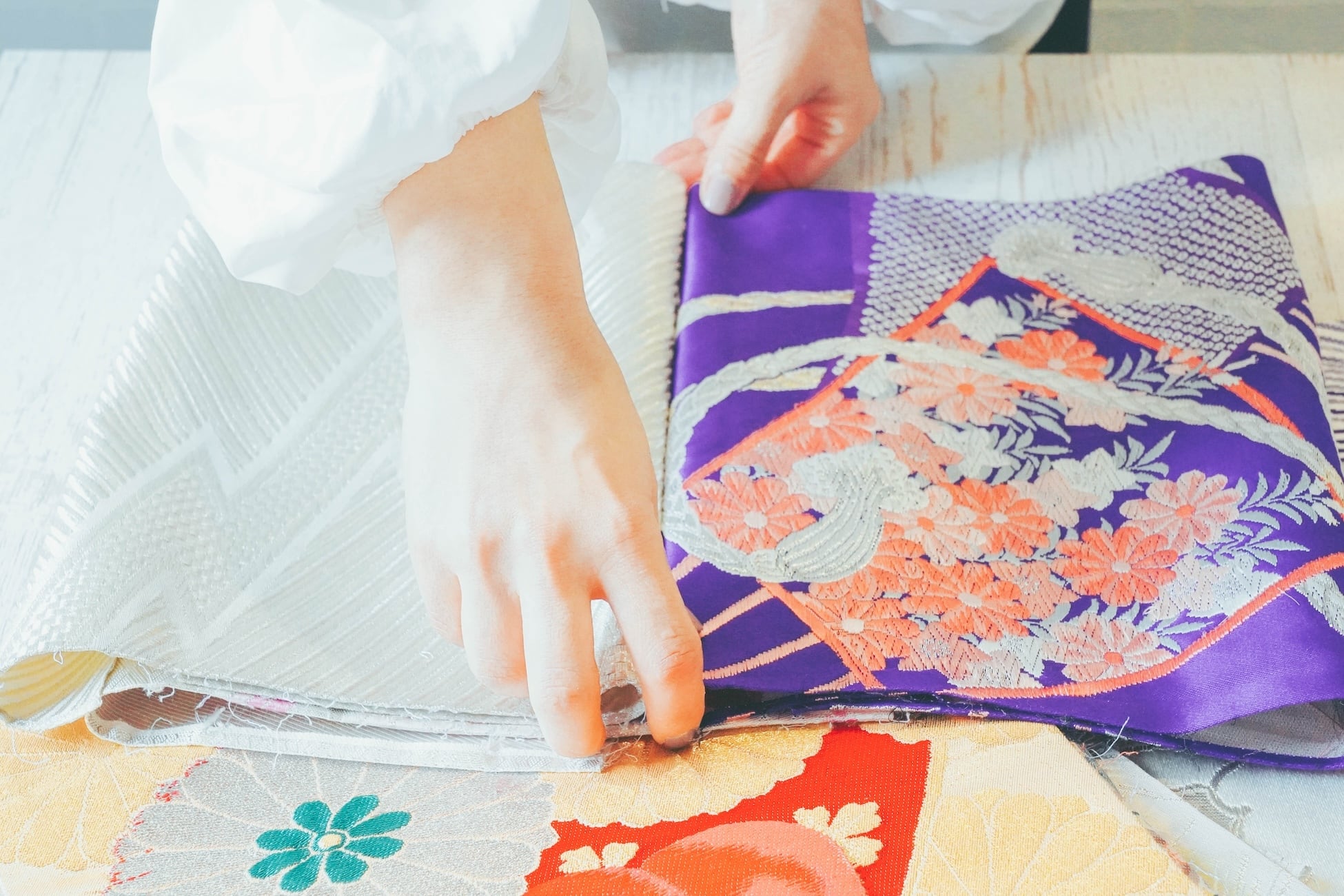 厳選した着物や帯を独自手法でメンテナンスし、さらに柄を選定して、一つ一つ丁寧に組みわせています。それぞれの領域の職人たちが、すべて手仕事で作り上げています。