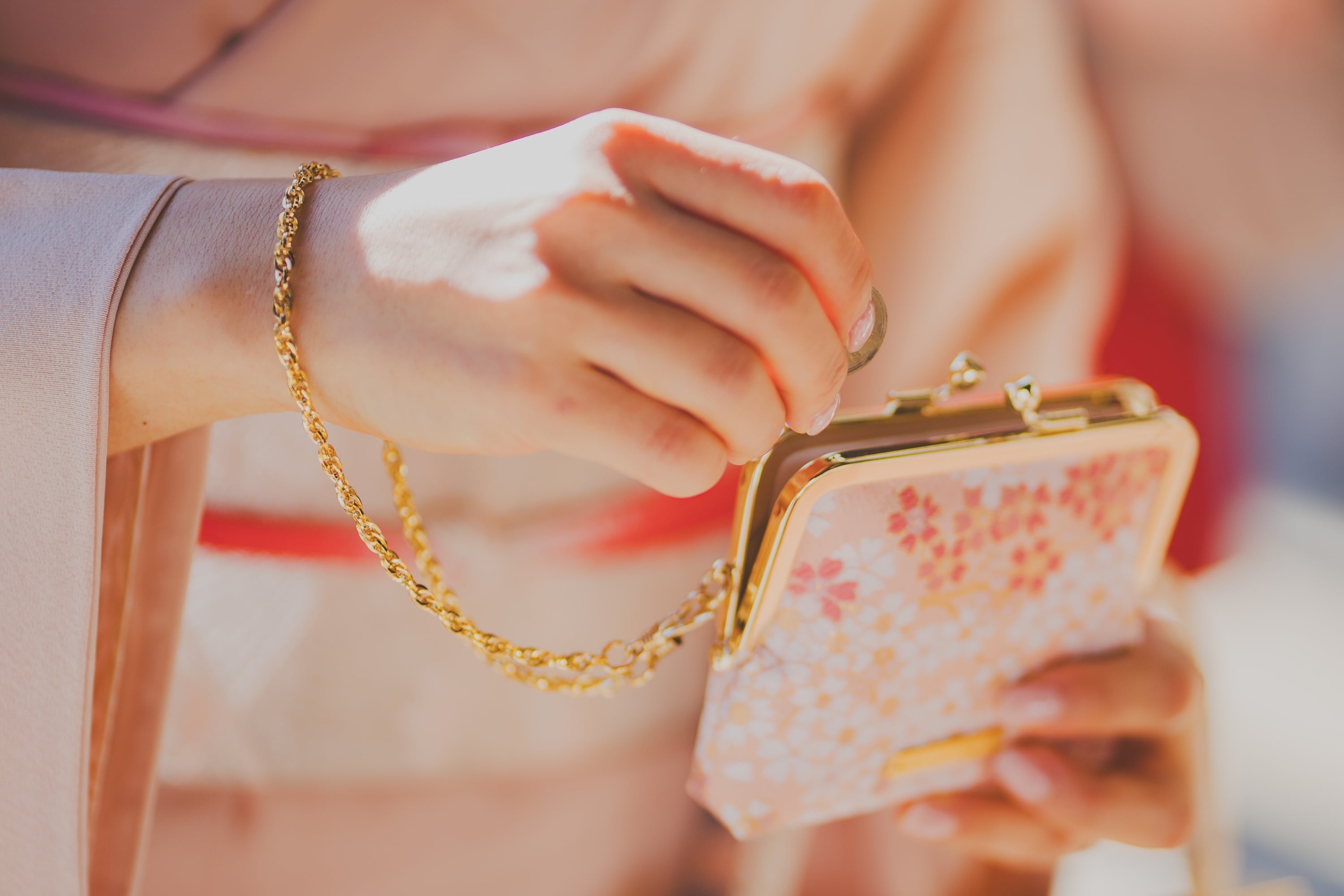 高級感のあるがま口に、華やかなゴールドチェーンを合わせたミニ財布。